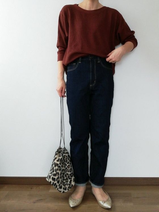 レオパード柄バッグをアクセントにプラスして、ゴールドのバレエシューズで、ほどよい大人カジュアルコーデに仕上げました。