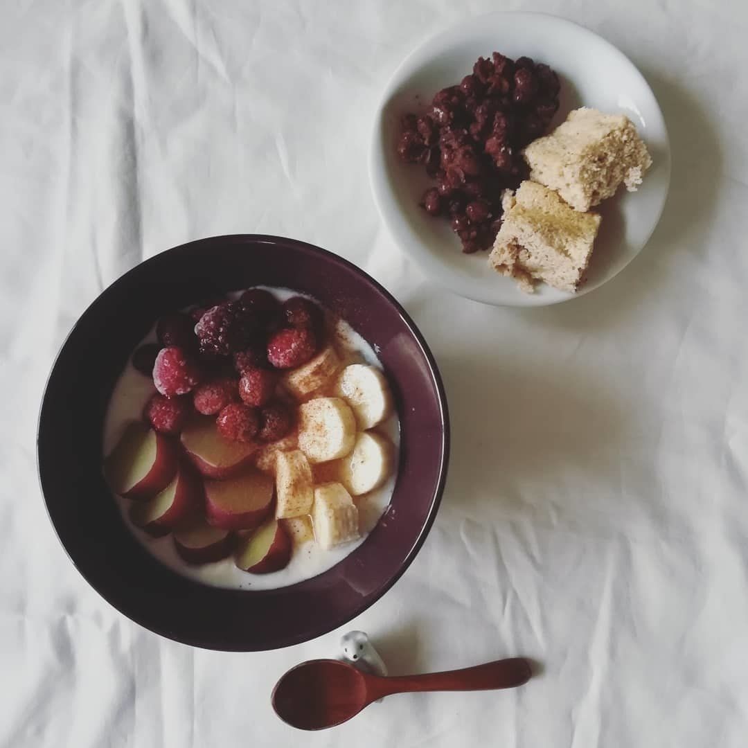 朝ごはんには、炭水化物を取り入れるようにしています。この日のメニューは、豆乳ヨーグルトにバナナ、さつまいも、冷凍ベリーをトッピングしたヨーグルトパフェと、小豆、おから蒸しパンにアガベシロップをかけたもの。朝に炭水化物をとっておくと、1日の食欲の波が穏やかになり、間食や暴食を防げるようになったと感じています。