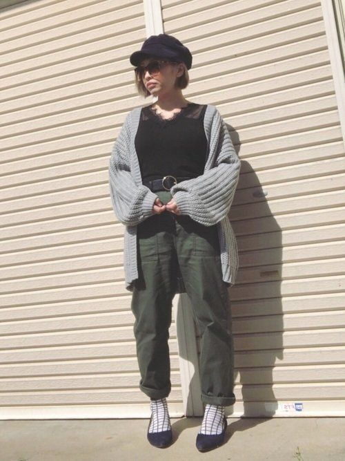 ベイカーパンツ×レースタンクトップに、ざっくりニットカーデを羽織った甘辛ミックススタイル。ネイビーのキャスケットをプラスすることで、コーデ全体のバランスが整い、クールな雰囲気の着こなしに。