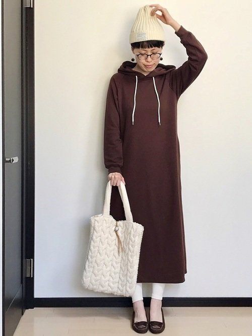ブラウンのスウェットワンピースに、白のニットキャップを合わせたデイリーコーデ。小物をすべて白で統一することで、シンプルながらも洗練された印象になります。帽子となじむニットトートがアクセントに◎。
