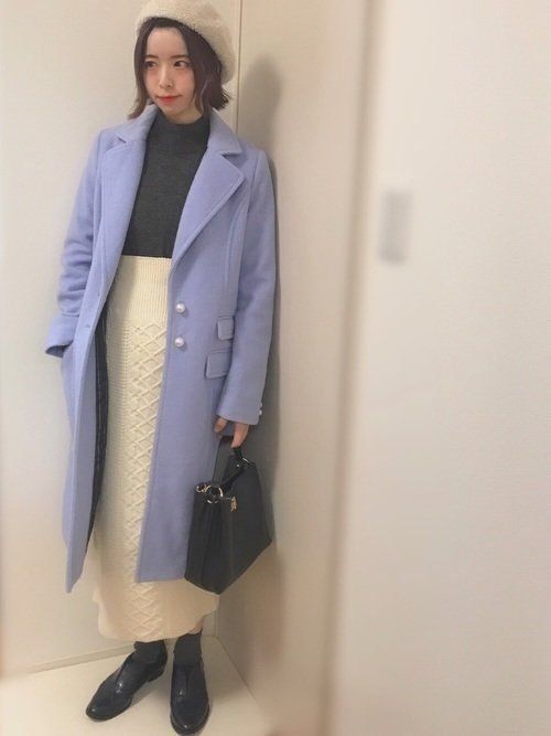 ふわふわした質感がかわいらしいベレー帽に、同色のニットスカートを合わせて大人ガーリーに。ブルーのチェスターコートを羽織れば、甘くすぎない洗練されたスタイルが完成します。