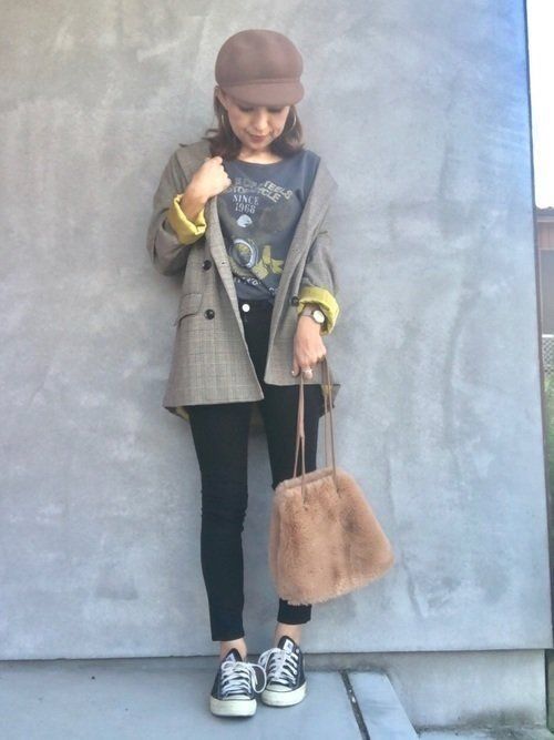 マニッシュなチェック柄ジャケットに、ブラウンのキャスケットを合わせてトラッドに。インナーにはあえてカジュアルなプリントTシャツをチョイスし、大人になじむテイストミックスコーデに仕上げて。