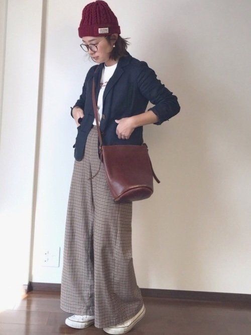 秋らしいボルドーのニットキャップは、シックな色味と好相性。ブラウンのチェック柄パンツやネイビーのジャケットを合わせて、落ち着いた印象の着こなしに。バッグと帽子の色味をそろえるのがポイント。