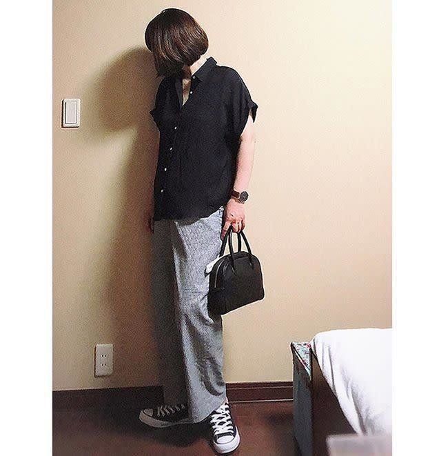 グレーのストレートパンツと、かっちりめの黒レザーバッグで、きちんと感を出しながらも、スニーカーはずしが◎。あえてデニムでカジュアルダウンさせないことで、清潔感もキープできます。