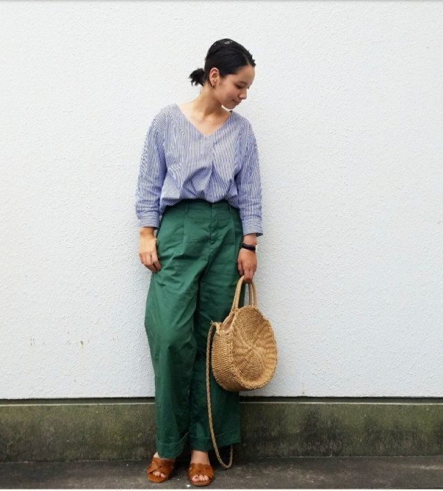 全体を爽やかなブルーグリーン系の同系でまとめることで、調和もしやすく知的なイメージに。ヘルシーな茶系小物と合わせれば、気負いのないナチュラルなスタイリングになります。