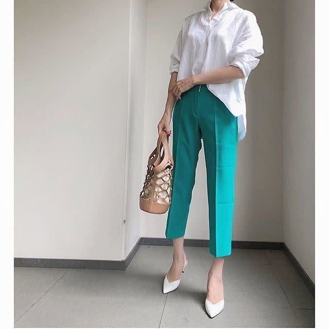 ここであまりフィット感のありすぎるシャツや、大きすぎるシルエットは、「清潔感」も欠けるのでNGです。より女性らしさを出すなら、カラーパンツとのコントラストを和らげるベージュや白の小物をプラスして。
