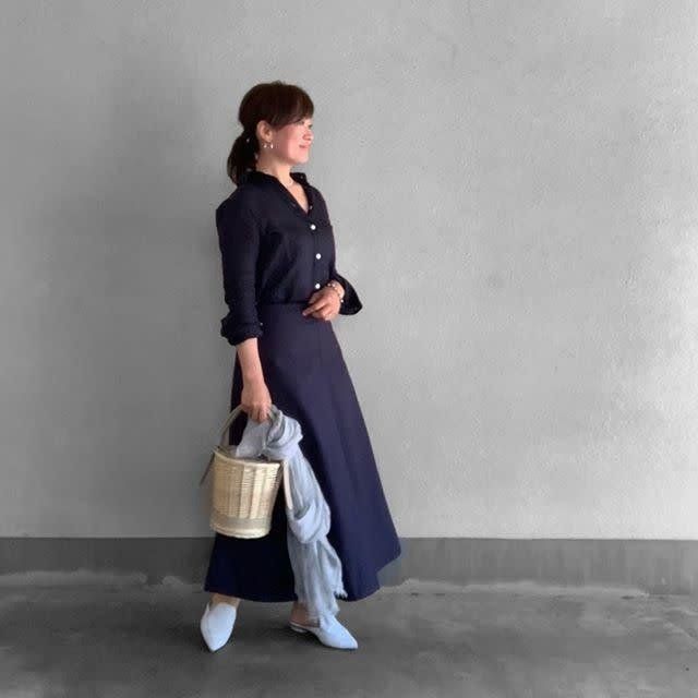 仕事や学校行事などで使える、ON/OFF対応可能なネイビーシャツ。ハリ感のある同色のロングスカートと合わせれば、きちんと感と清潔感を共に携えたコーデの完成!