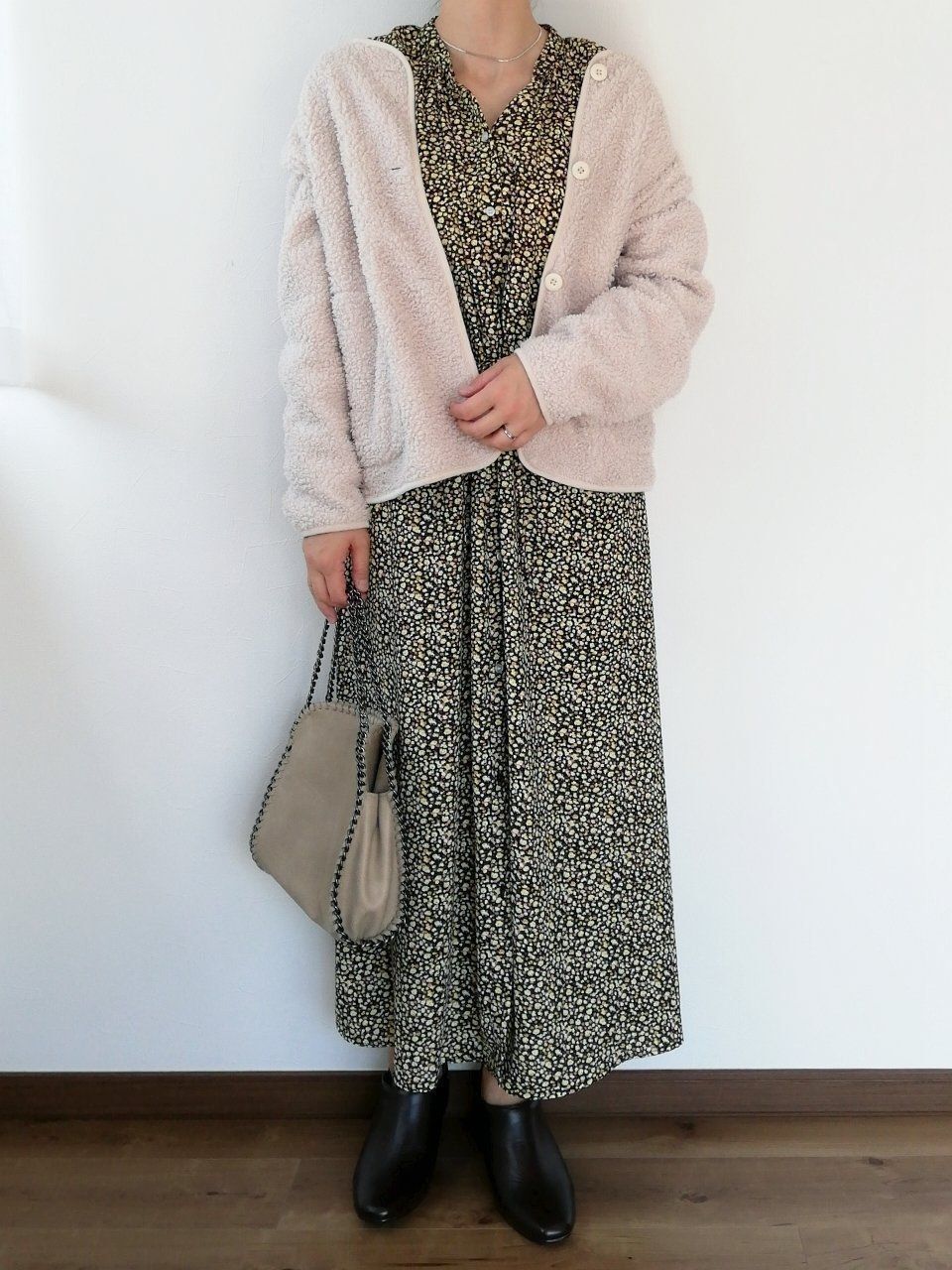 黒ベースの花柄ワンピースにオン。フェミニンな印象のワンピースを今年らしくカジュアルダウン。ゆるめにえりを抜いて着るとより今っぽい雰囲気に。