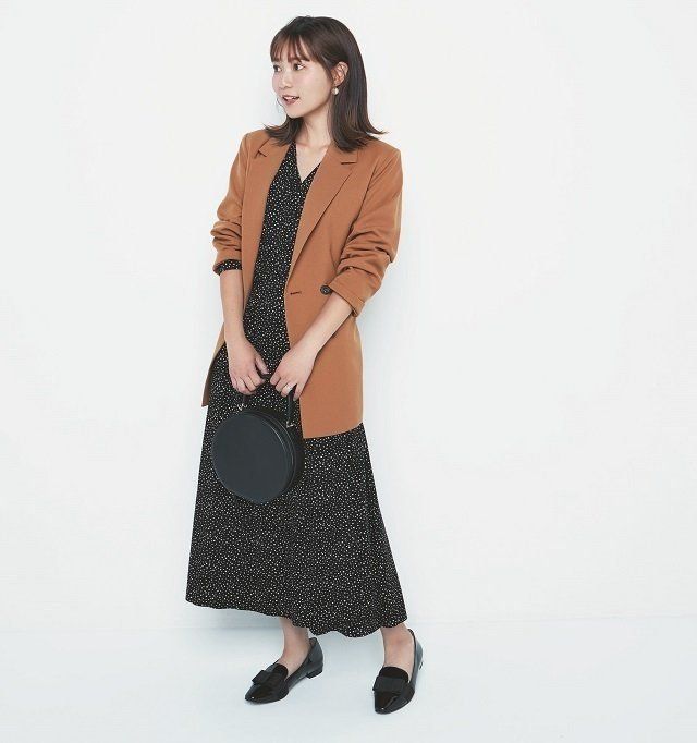 ジャケット/着回し カシュクールワンピース ※一部店舗のみの販売¥4,990/UNIQLO/INES DE LA FRESSANGE(UNIQLO) ピアス¥2,800/phoebe(Phoebe+) バッグ¥7,490/MANGO(LOCONDO) ローファー¥15,800/WASHINGTON(銀座ワシントン銀座本店)