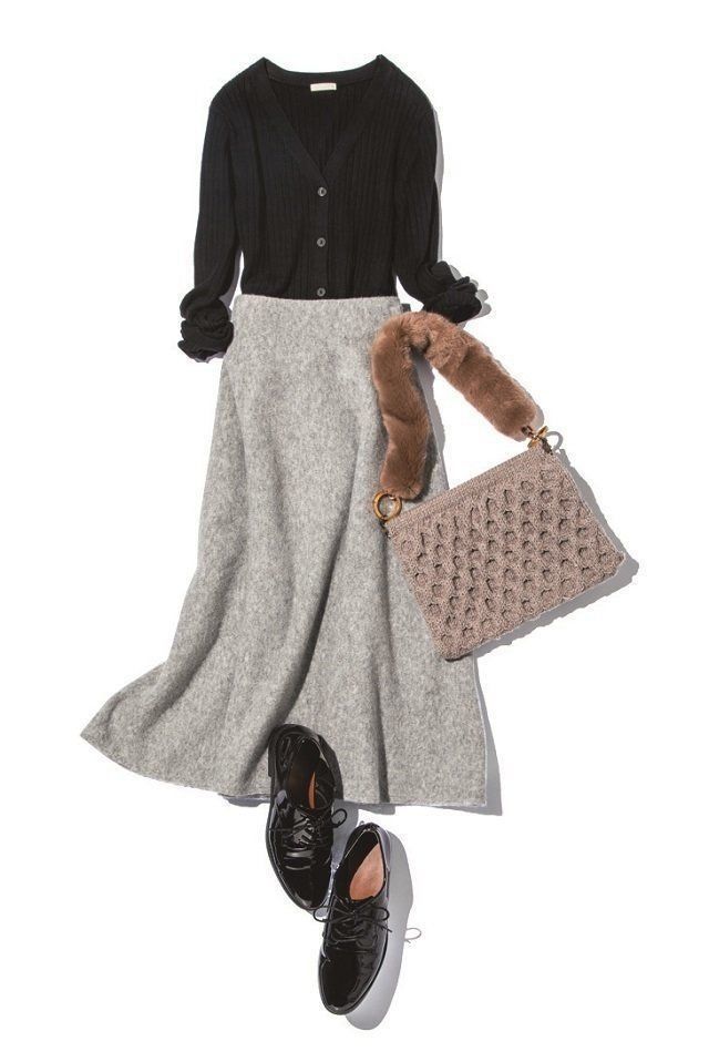 シンプル&ベーシックな黒のニットカーディガンをエレガントに導いてくれるのは、スカートの上品なフレアラインと高見え素材のおかげ。