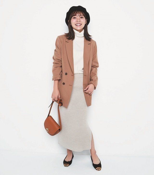 ジャケット/着回し カシミヤタートルネックニット¥8,990、ニットスカート¥2,990/UNIQLO ベレー帽¥8,000/arth(override 明治通り店) バッグ※一部店舗のみの販売¥1,990/GU フラットシューズ¥6,400/RANDA