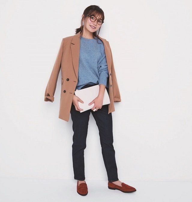 ジャケット/着回し ニット¥2,990、ハイライズスキニーデニム¥3,990/UNIQLO 眼鏡¥4,000/JINS バッグ¥8,000/ヒッチハイクマーケット ローファー¥6,900/スタジオ(WASH ルミネ横浜店)