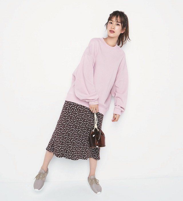 今季人気のオーバーサイズのスウェットも、ピンクを選べば女性らしい印象に。