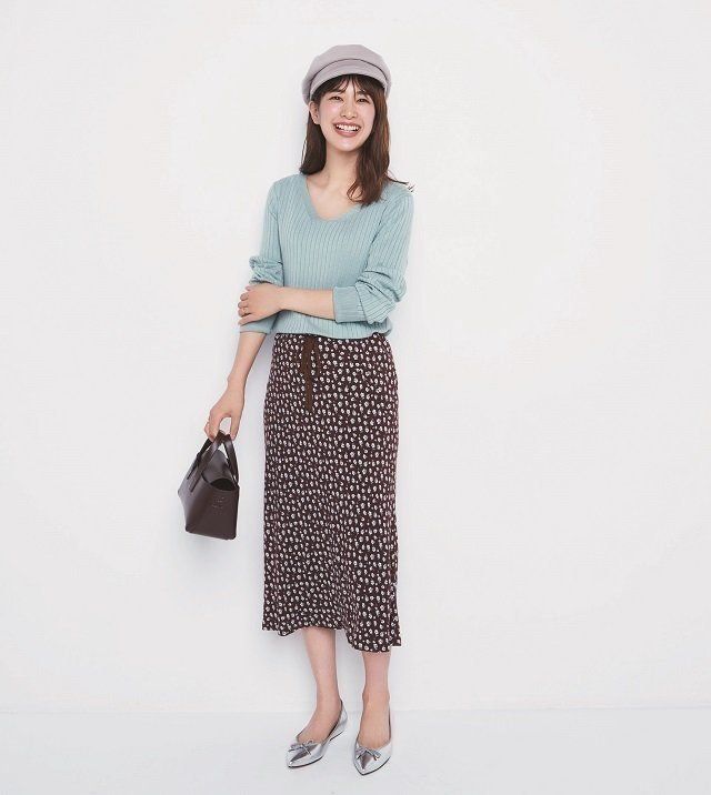 スカート/着回し ニット※ 10月下旬発売予定¥1,490/GU バッグ¥14,000/HASHIBAM(I コレクト) キャスケット¥12,000/arth(override 明治通り店) バレエシューズ¥15,000/MODE ET JACOMO carino(LOCONDO)