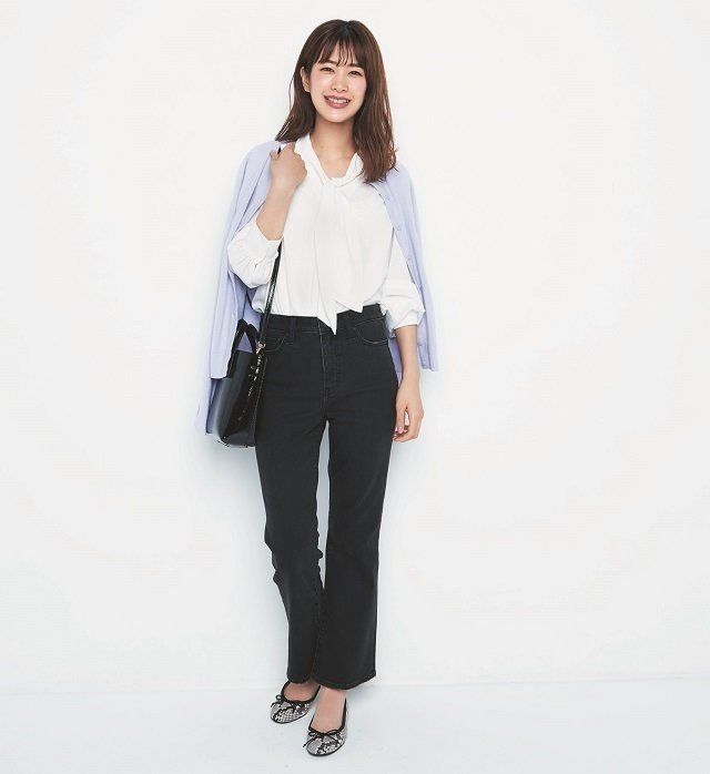 ブラウス/着回し カーディガン※ 9月中旬発売予定¥1,990/GU フレアアンクルデニム¥3,990/UNIQLO バッグ¥13,000/HASHIBAM(I コレクト) バレエシューズ¥22,000/インター ショシュール(ゼア ニュウマン新宿)