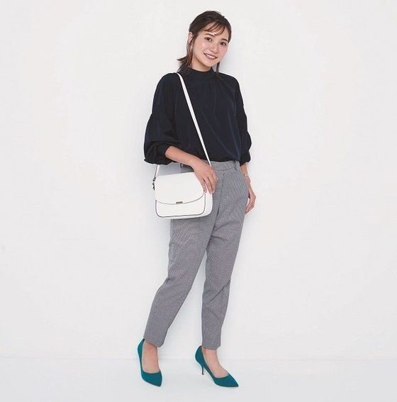 パンツ/着回し ブラウス※ 9月上旬発売予定¥1,990、バッグ※一部店舗のみの販売¥1,990/GU ブレスレット¥10,000/Jouete パンプス¥7,900/VANITY BEAUTY(LOCONDO)