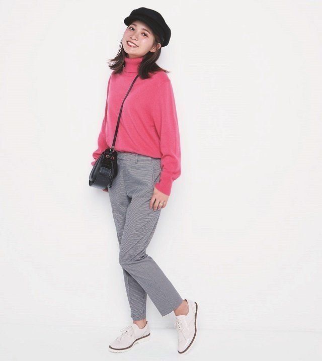 パンツ/着回し カシミヤタートルネックニット¥8,990/UNIQLO キャスケット¥12,000/arth(override 明治通り店) バッグ¥3,990/MANGO(LOCONDO) シューズ¥7,400/ILIMA(LOCONDO)