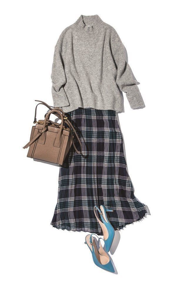スカートにネイビー×ブルー系の落ち着いた色合いのチェック柄を選ぶのも、大人らしく仕上げるためのポイント。