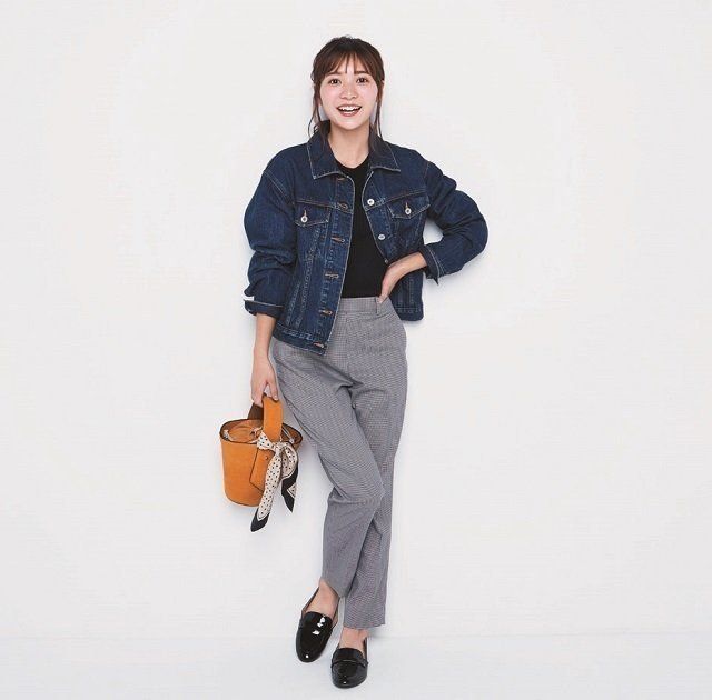 パンツ/着回し デニムジャケット¥2,990、ローファー※一部店舗のみの販売¥1,990/GU ニット※一部店舗のみの販売¥3,990/Uniqlo U(UNIQLO) バッグ¥7,490/MANGO(LOCONDO) バッグに結んだスカーフ※一部店舗のみの販売¥1,990/UNIQLO/INES DE LAFRESSANGE(UNIQLO)