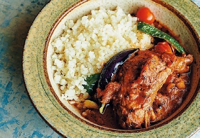 カリフラワーライスはサラサラしているので、カレーなど汁けのある物に最適。「小麦粉不使用のスープカレーならより低糖質。おかずは照り焼きなど、たれがからんだ物が合います」
