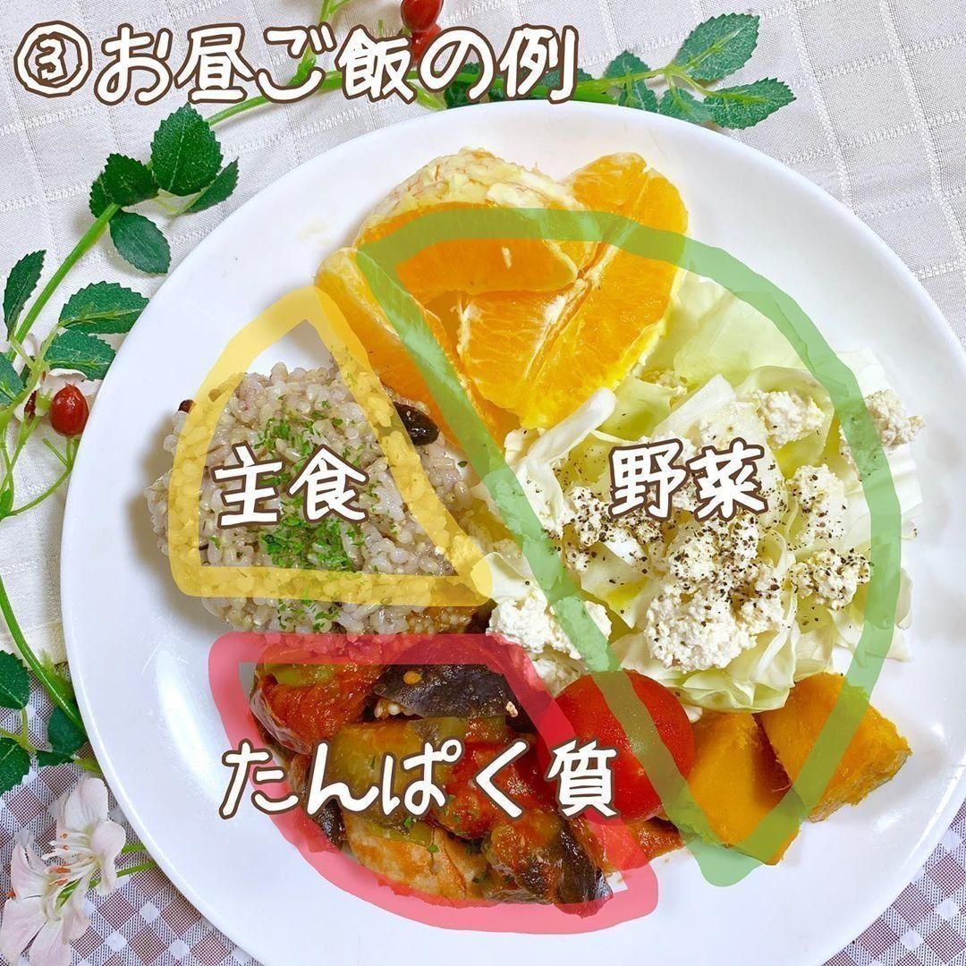 朝・夜は20cm前後、昼は25cm前後のワンプレートをチョイス。お皿を円グラフに見立て、野菜50%、たんぱく質30%、主食20%ぐらいの割合で盛りつけます。こうすれば、カロリー計算や計量をすることなく、栄養バランスのよい食事が完成♪ダイエットの停滞期も、この方法で乗り越えられたそうですよ。
