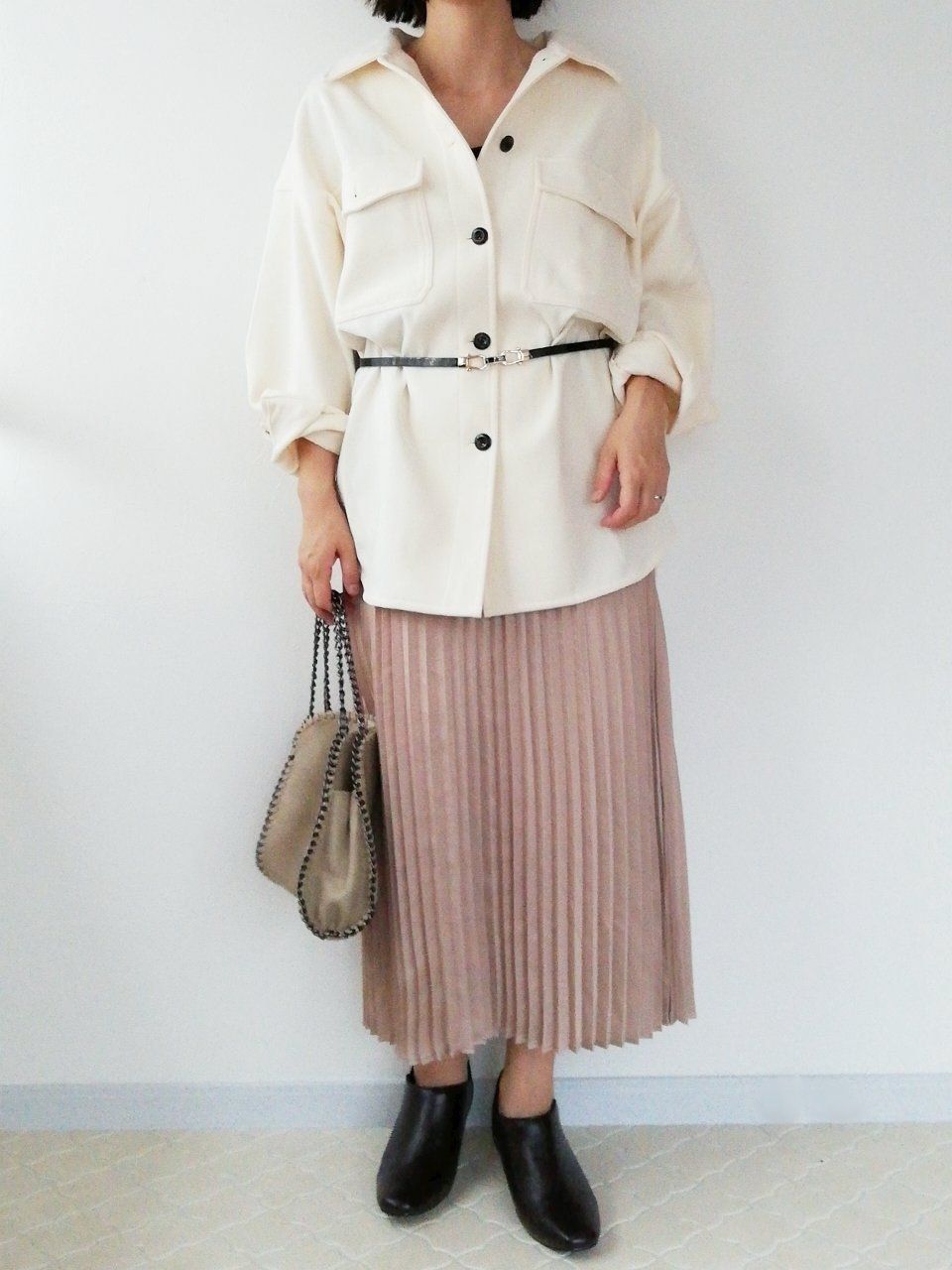 細めのベルトなら、きれいめな印象に。ピンクベージュのプリーツスカートで、レディライクな着こなしにまとめました。