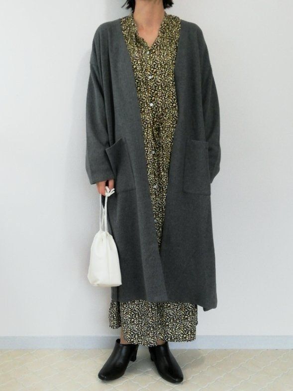 ナチュラルな雰囲気のワンピースに、大人っぽいコーディガンを合わせることで、ほっこりしすぎないほどよい大人ナチュラルコーデが完成します。