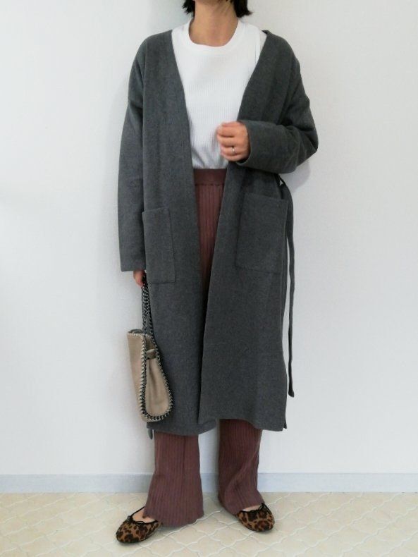 ワッフルT×リブパンツのカジュアルコーデにさらりと羽織ったロング丈のコーディガンは前を開けると、リラックスした雰囲気に。