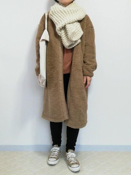 「ちょっとそこまで」のシンプルカジュアルコーデには、ボリュームあるマフラーでアクセントをプラス。おしゃれさと暖かさを叶える、冬のご近所コーデに。
