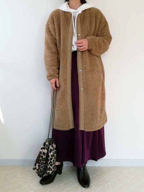 ボアコートとサテンのスカートの、異なる素材の組み合わせでパーカーをおしゃれに格上げ!