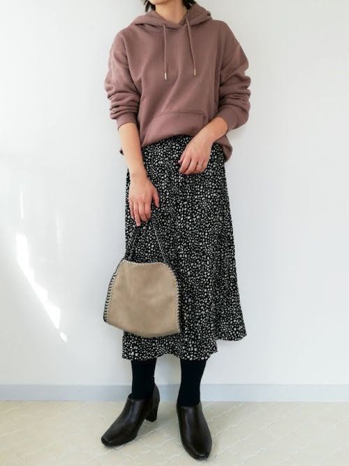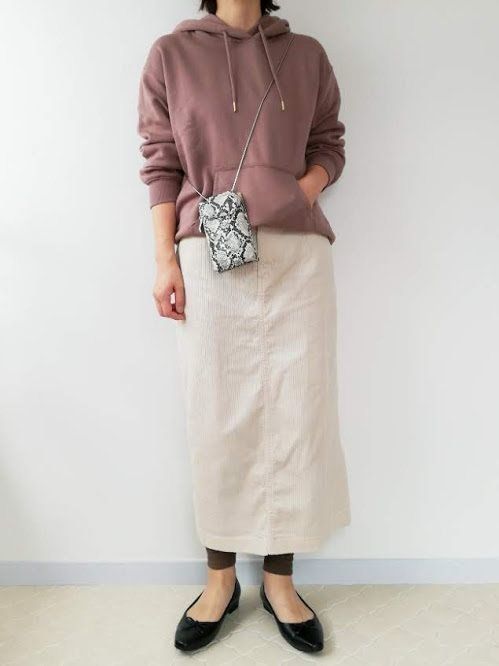 ジャストサイズのパーカーは、スカートとも相性ばつぐん。大人っぽいロングタイトスカートともバランスが取りやすく、ほどよくカジュアルにまとめてくれます。