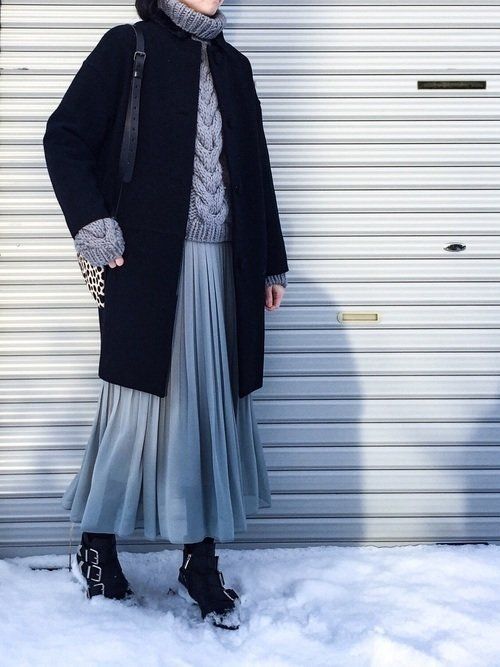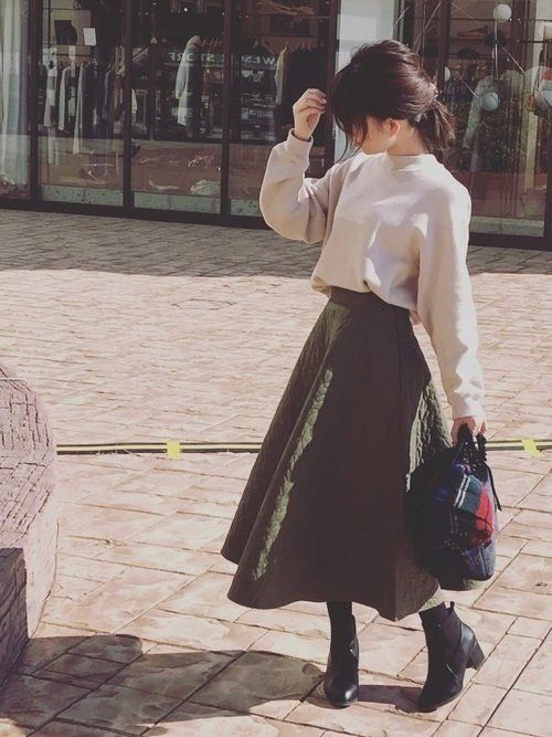 中綿が入っているユニクロのキルトスカートは、この時期にはうれしい、あたたかい素材です。ミモレ丈なので、ショートブーツや靴下で遊んでみてもいいですね。スカートは2,990円です。
