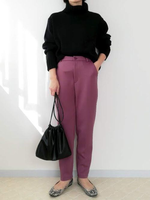 デニムをカラーパンツにチェンジすると、今っぽくまわりと差がつくコーデに。ベーシックな黒タートルなら、ボトムスの色を選びません。大人女子こそトライしてほしい、きれいめ最旬コーデのできあがり!