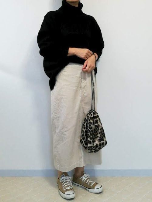 季節感あるコーデュロイスカートを合わせて。ボリュームあるニットには、すとんと落ちるIラインスカートが相性よし!ロング丈のタイトスカートなら大人もトライしやすく、今っぽい印象になって◎。