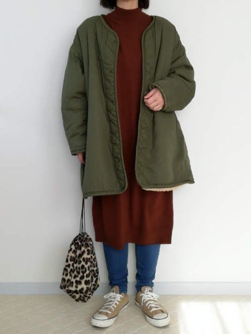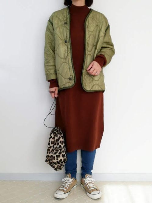 コンパクトなショート丈のアウターならグッドバランス!ミリタリーなライナージャケットで、ニットワンピースをカジュアルにシフト。