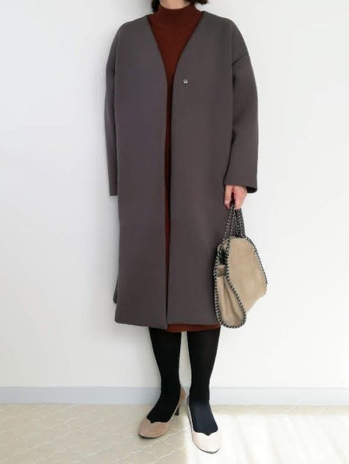 ワンピースと同じぐらいのロング丈コートならきれいめな雰囲気に。ヒールのあるパンプスでスタイルアップ。モードなチェーンバッグでアクセントをプラスして、のっぺり見えるのを回避!