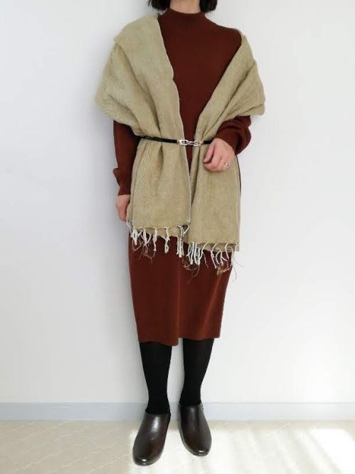 ストールを羽織ってベルトをONすれば、ベスト風の着こなしに。プレーンなワンピースだからこそ、ストールアレンジが映えるのでトライしてみては?