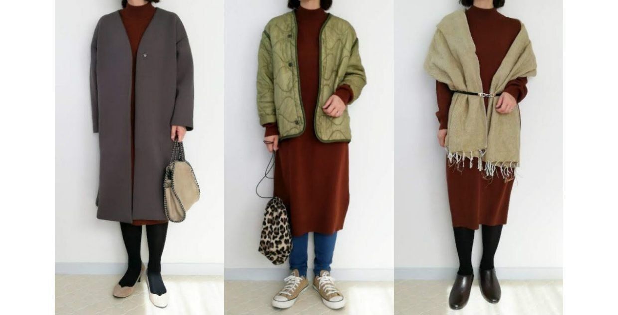 長すぎず短すぎない、膝下丈のニットワンピース。ミディアム丈のアウターを合わせると、どっちつかずのアンバランス感が出てしまい、もっさりした印象に……。