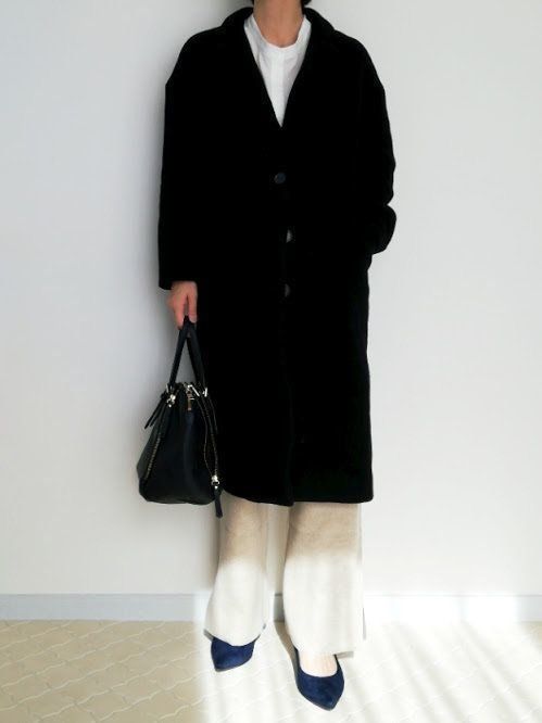 コートと同色のインナーだと、首まわりがのっぺりしてどこかさびしげな印象に…。