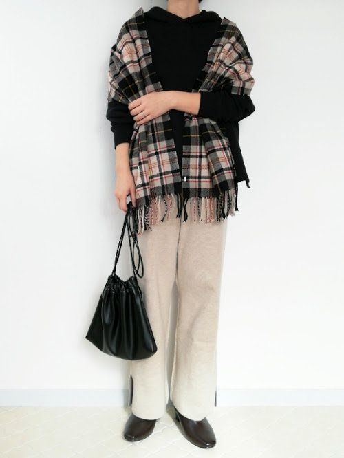 レザーのバッグとショートブーツできちんと感をプラス。無地コーデに映えるチェックストールを羽織って、防寒しながらおしゃれ度アップ!