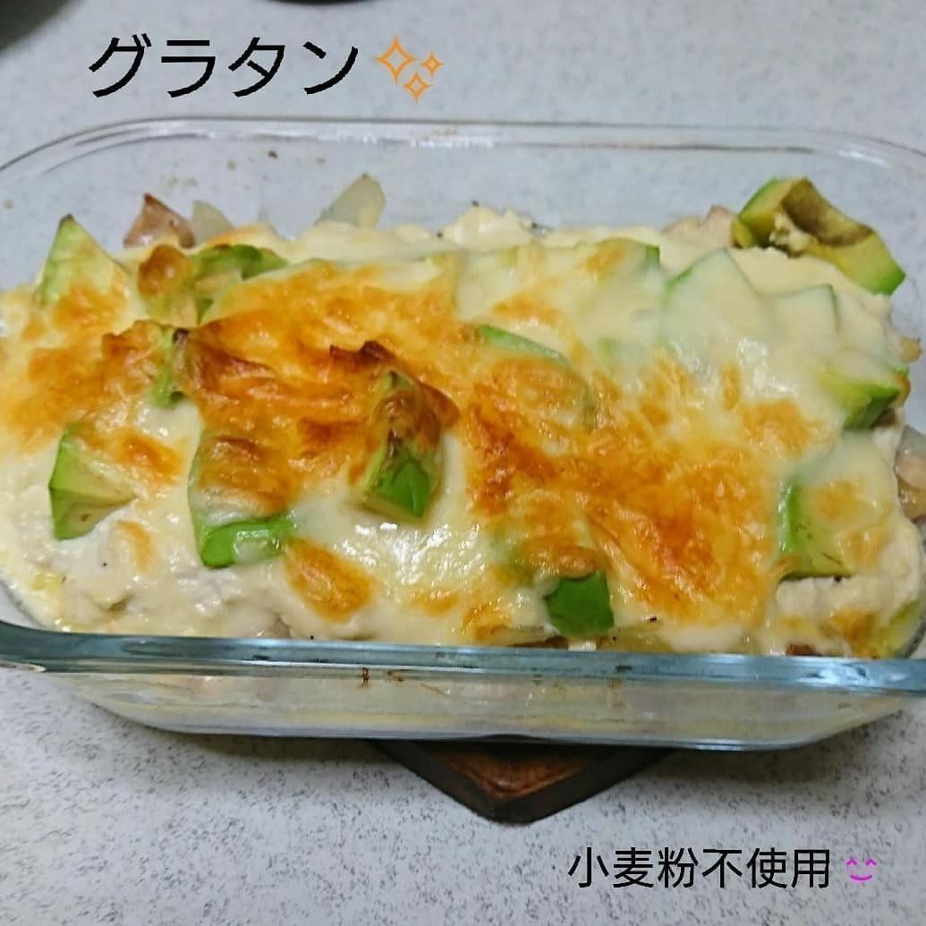 スライスした玉ねぎと鶏肉をオリーブオイルで炒めて、耐熱皿にのせます。その上に、豆腐とマヨネーズをブレンダーで混ぜたソースをかけ、アボカドとチーズをトッピング。時短のために電子レンジで加熱してから、オーブンで焦げ目をつければ完成です。豆腐はある程度水切りをしておくと、味が薄くならないのだそう。