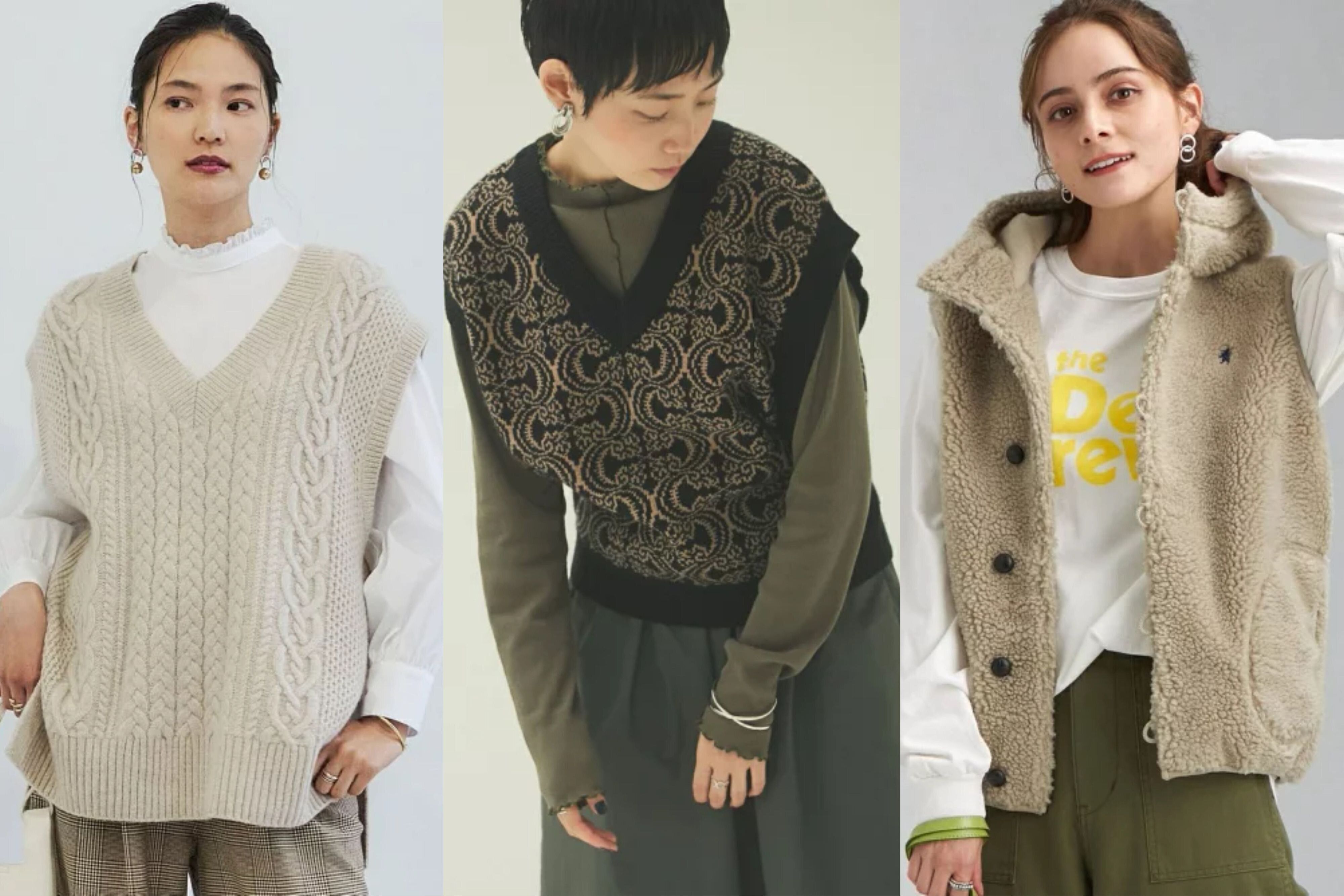 どんなアイテムとも相性がいいベスト。インナーが違うだけで、さまざまな雰囲気に変えることができますよ!