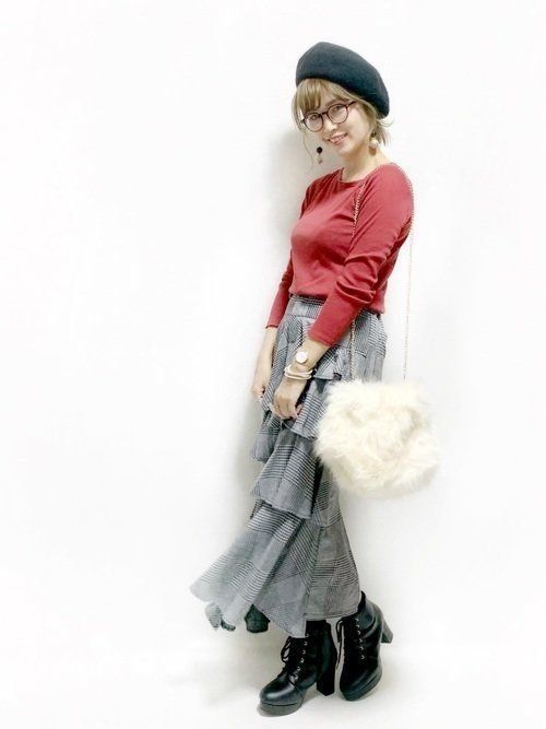 派手になりがちな赤でも、落ち着いた色味なら合わせやすいですね。さりげないアシンメトリーネックで、スッキリと着られるのも◎。フリルのスカートと合わせて女性らしさアップ。