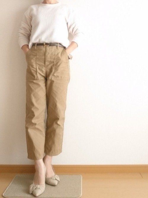何でも合う白トップスですが、春っぽく着るならベージュがおすすめ。足首が見える丈のパンツと合わせると抜け感も出て、より春らしいスタイルに。大人っぽく着こなすならパンプスを合わせるといいですよ。