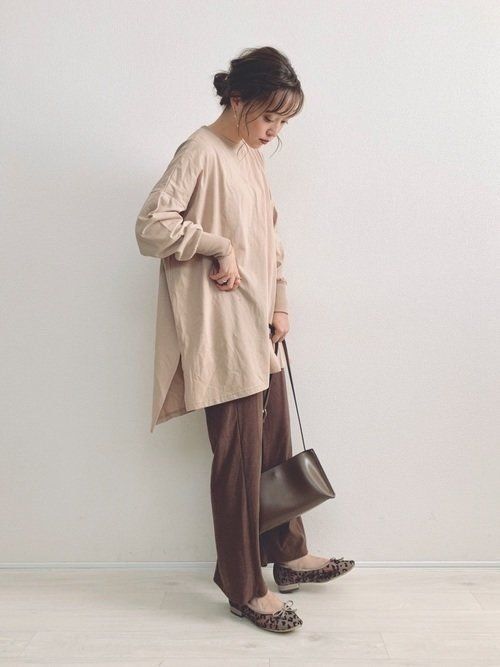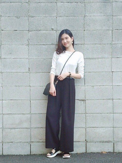 フィット感が絶妙のカットソーで、スッキリと着こなすシンプルコーデ。ボトムをワイドパンツにして全体のバランスもばっちり。コーデがシンプルなので、アクセやバッグをポイントにするともっとオシャレに。