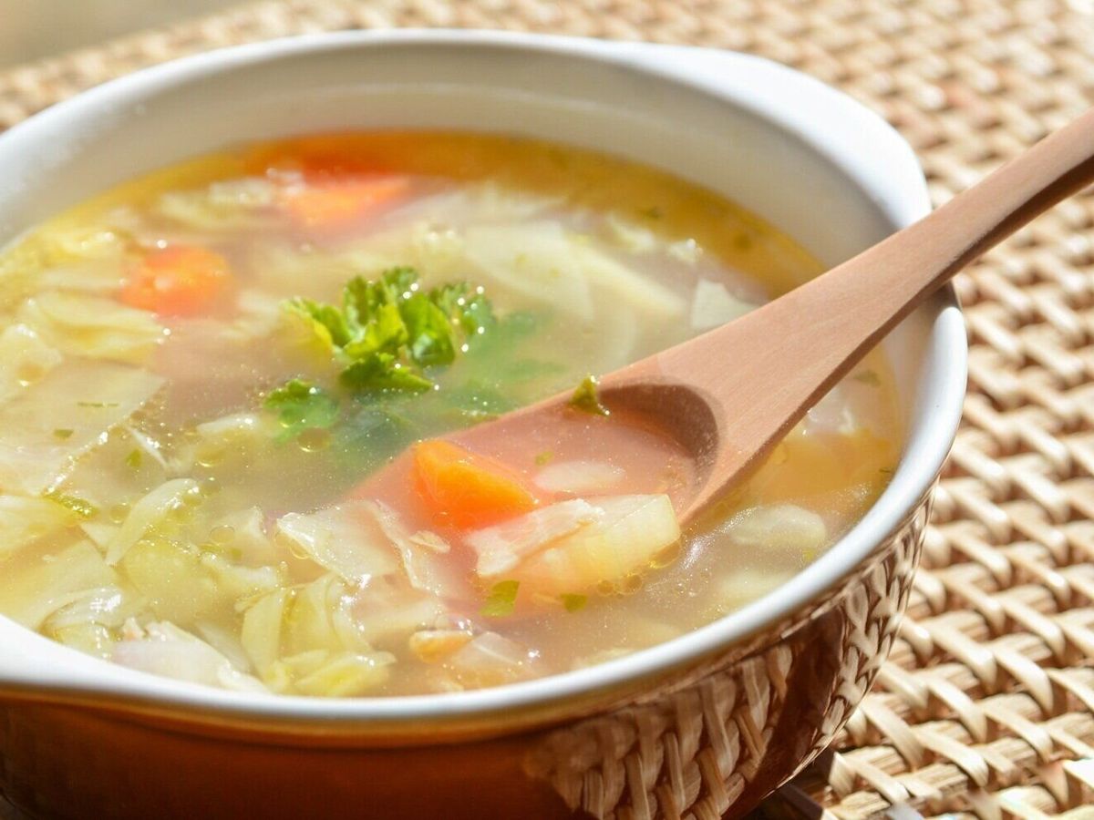 かさ増しをするのなら炭水化物をプラスする代わりにゴロッと大きめにカットした野菜を加えて、カロリー・糖質を抑えながら満腹を感じられるスープにしてみては。食後の血糖値の上昇を緩やかにしてくれる水溶性食物繊維を含む茹でた押し麦をプラスするのもオススメです。