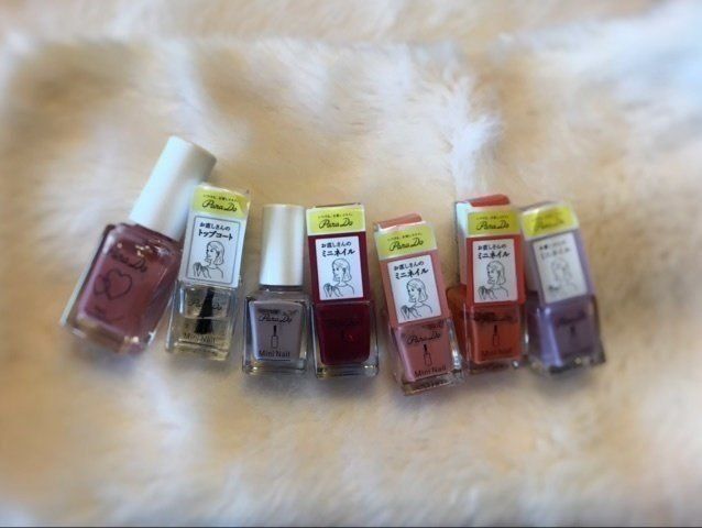 5色のミニマニキュアにトップコートとネイルファンデーション、計7本で500円ほどでした。