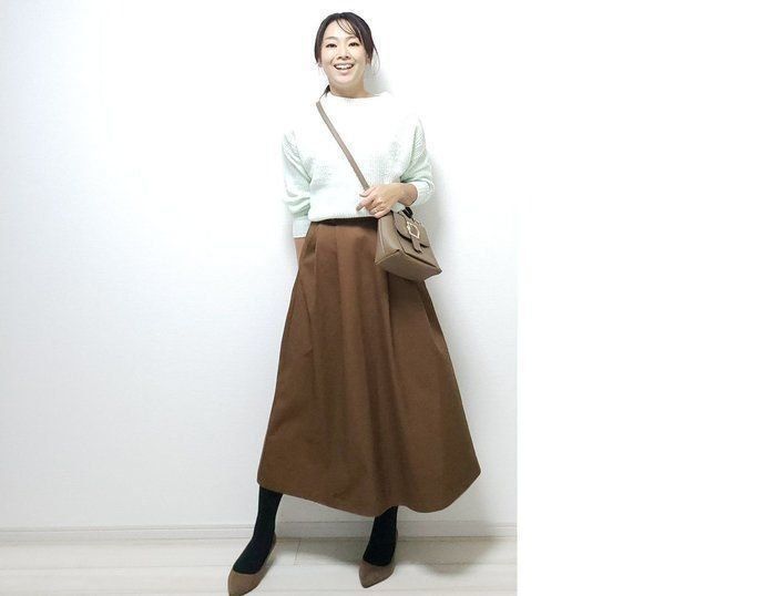 スカート、バッグ、パンプスをブラウンに。この色合わせは、こなれて見えておしゃれですよ。