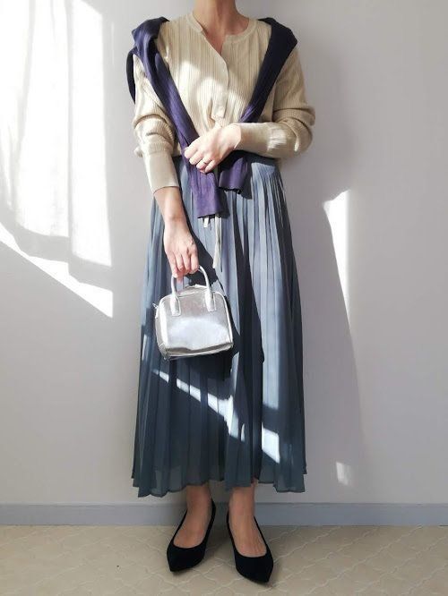 旬なくすみブルーのプリーツスカートに合わせたきれいめコーデ。
