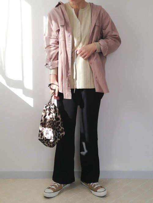 シャツを合わせたカジュアルな着こなし。何にでも合うシンプルな黒パンツは、使いやすいのですが春らしさには欠けるかも?
